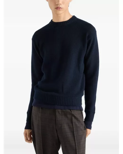 This sweater made of high quality cashmere has a classic silhouette with soft lines. The garment with ribbed knit trim combines comfort and contemporary sophistication. The sartorial logo label and tonal triangle logo decorate the style. plain knit regular fit ribbed knit crew-neck semi-raglan shoulder ribbed knit cuffs and hem Knit triangle logo sartorial logo label with the Prada logo on the front The model is 188 cm tall and wears a size 48 height: 66cm