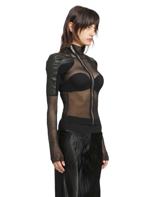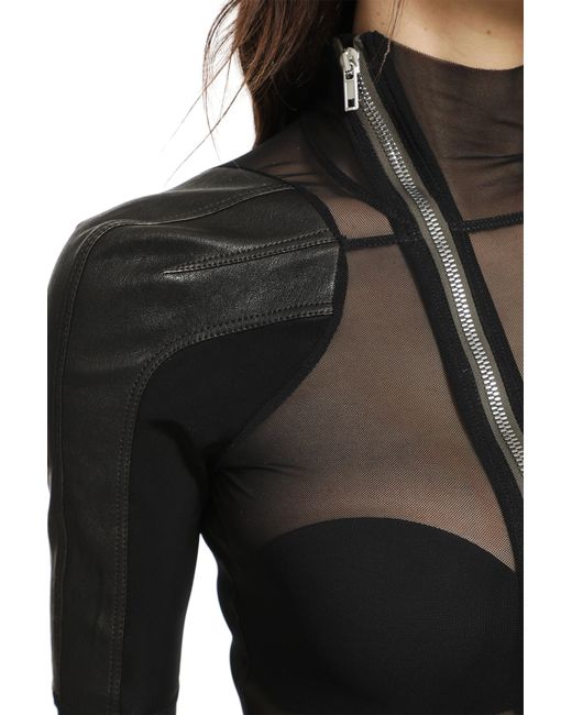 A sleek, body-contouring silhouette that merges technical stretch nylon with leather accents. The sharp diagonal zip and sheer texture reflect Rick Owens' signature fusion of utility, structure, and dark sensuality.