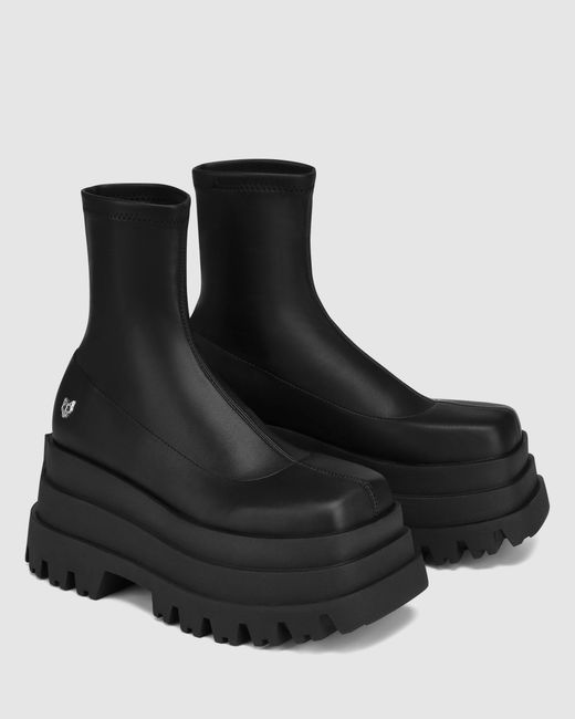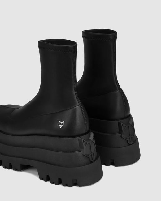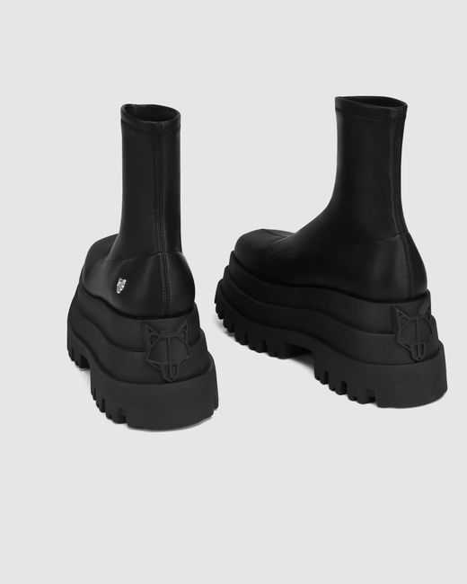 Product Description Sassy, our brand new A/W 22 new ankle sock boot has arrived. Featuring a Custom Naked Wolfe designed 3 tier outsole with a Wolfe Head logo embedded in the heel and Square toe detail. Features Vegan Stretch Upper Fabric Stretch Lining Pull on design 90mm Heel Height Custom lightweight 3 tier outsole Naked Wolfe famous rubber Wolfe head mould in uppers heel