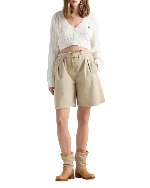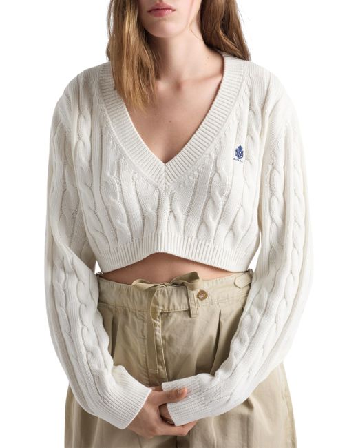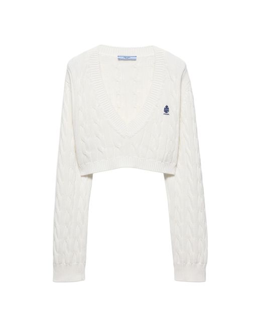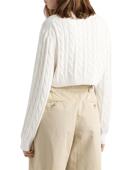 Long sleeves Cable-knit Cropped fit Ribbed knit neckline Semi-raglan shoulder Ribbed knit cuffs and hem Embroidered logo Dyed garment 100% Cotton Imported. Lsd Rtw - Prada Rtw > Prada > Saks Fifth Avenue. Prada. Color: White. Size: 2.