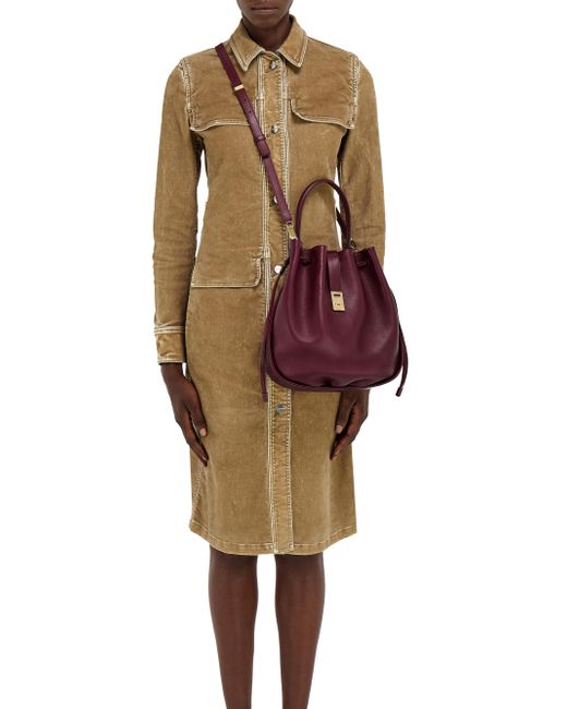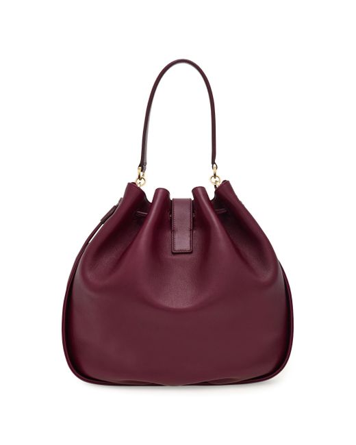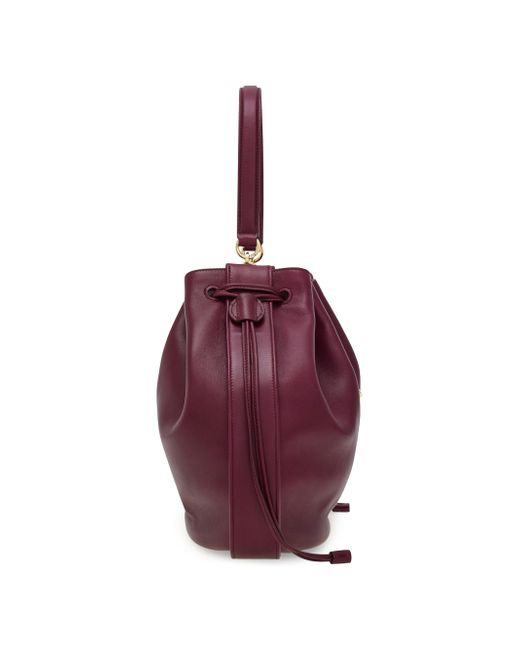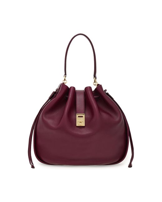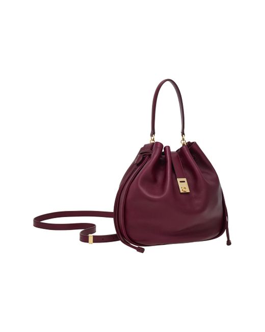 This Hug bucket bag from FERRAGAMO is crafted of supple leather and featuresa drawstring top with goldtone hardware, including a small lock detail at the front. The dual carry options include a top handle and a detachable crossbody strap for versatile wear Adjustable, removable crossbody strap Interior: one zip pocket Drawstring closure Flap with turn-lock closure Leather Lining: cotton Imported SIZE Top handle: about 6.75" drop Adjustable, removable crossbody strap: about 21.5" strap length ABOUT THE BRAND Italian designer Salvatore Ferragamo began his journey in 1927 in Italy with a vision of creating the world's most beautiful shoes. Since its inception, Ferragamo has expanded to include clothing, accessories and beauty under the creative direction of Maximilian Davis-who brings a minimalist-meets-maximalist aesthetic to the brand. Handbags - Ferragamo Handbags > Ferragamo > Saks Fifth Avenue. FERRAGAMO. Color: Plum.