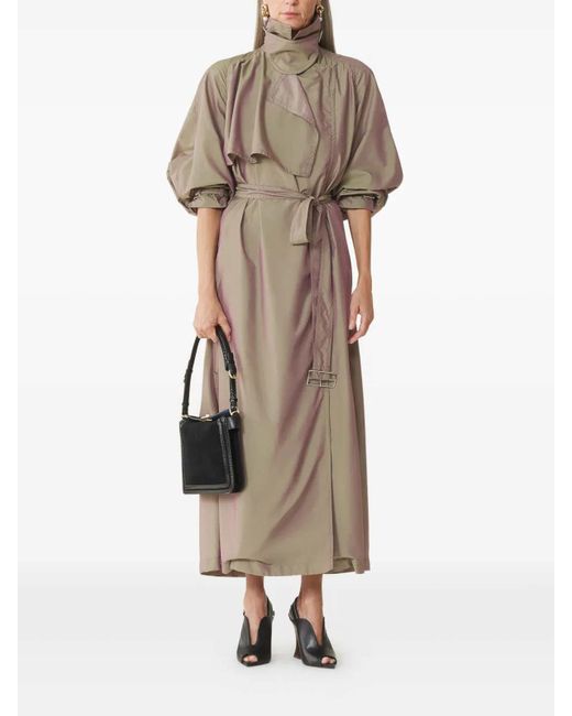 trench coat with buckle, button closure, multi-layered design, polo style collar.