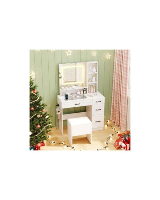 Elevate your beauty routine with our elegant vanity desk, featuring a 3-color Led mirror for perfect lighting, a built-in charging station, and ample storage. The sleek tempered glass tabletop and thoughtful design details, like an anti-tip device, make it stylish and functional. Ideal for makeup enthusiasts seeking convenience and organization.