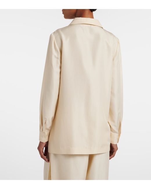 Material: 100% silk. Care instructions: dry clean. Made in Italy. Designer color name: Vanilla. Collar: classic (Straight point). Cuff: buttoned. Pockets: patch pockets. Closure: buttoned front. Silk.