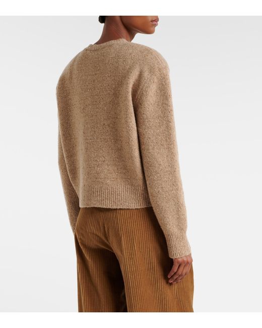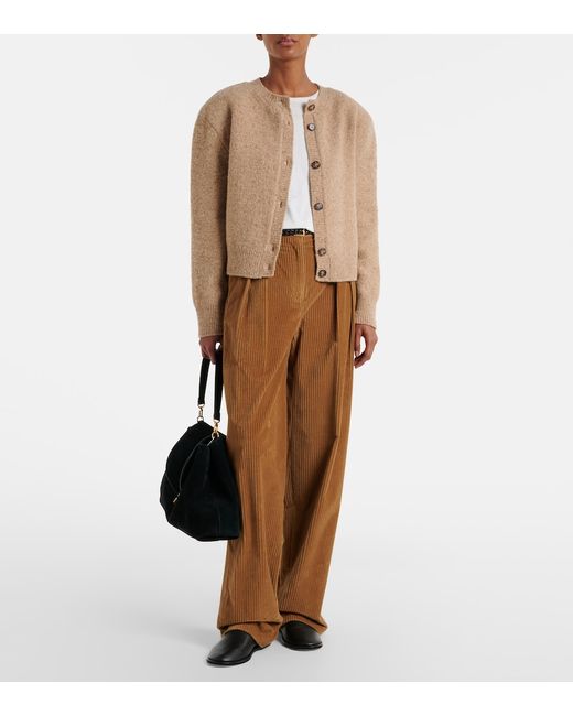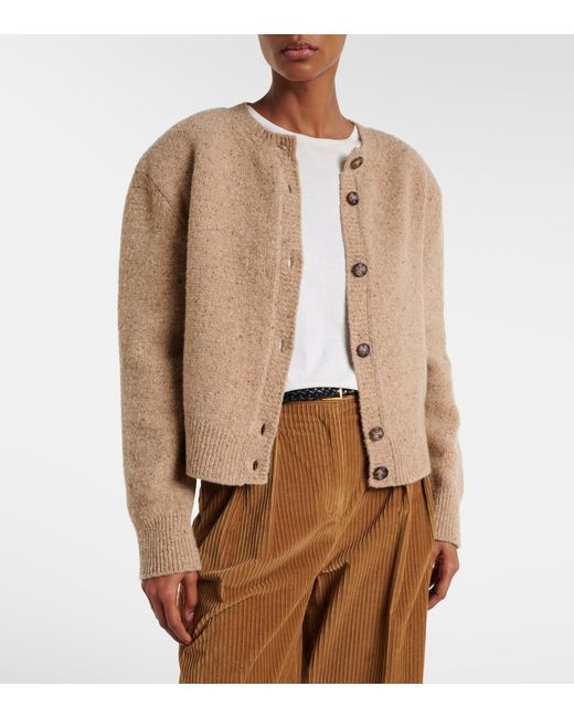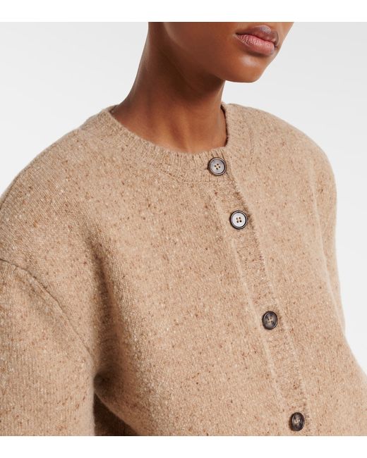 Material: 100% wool (merino wool). Care instructions: dry clean. Made in Italy. Designer color name: Oat Melange. Closure: buttoned front. Hem: ribbed. Cuff: ribbed. Collar: crewneck. Shoulder pads. Wool.