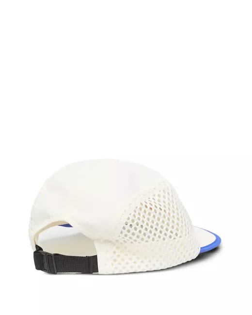 white mesh panels logo patch to the front flat peak contrast trim adjustable strap to the rear buckle fastening