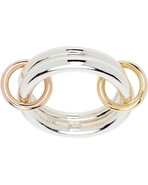 Connected and stacked band rings in sterling silver. · Sliding hoops in solid 18k yellow and rose gold · Hallmarking at inner bands Supplier color: Silver