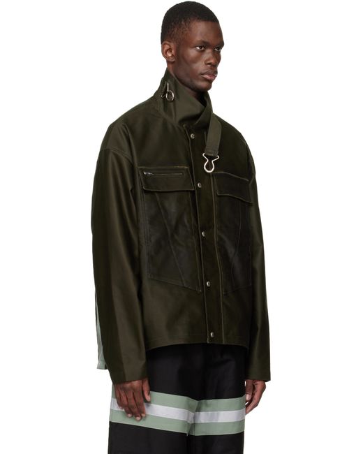 Hand-waxed cotton moleskin jacket. · Toggle tab at spread collar · Zip closure with press-stud placket · Flap pockets and zip pocket at chest · Reflective trim at side seams and sleeves · Press-stud fastening at cuffs · Drawstring at interior waist · Welt pockets at interior · Full taffeta lining Supplier color: Waxed Khaki
