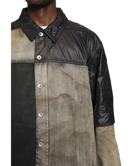 A bold expression of Rick Owens utilitarian aesthetic, this jacket merges workwear references with a contemporary, oversized attitude. The jumbo silhouette is defined by a patchwork construction combining shell and denim, enhanced by a waxed effect that adds depth and a subtly coated finish.