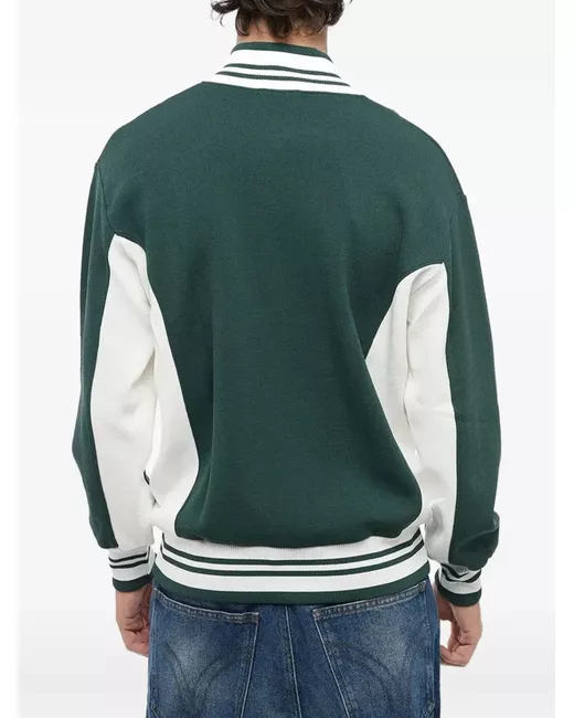green panelled design logo patch at the chest front zip fastening stripe-trim baseball collar long sleeves stripe-trim cuffs and hem