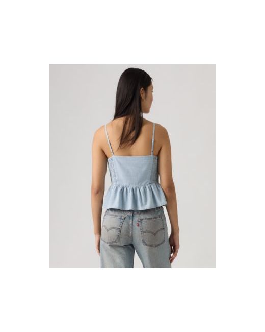 Turn every sunny outing into a style moment with this Levi's Monet blouse, delicately designed in a floral print with a fitted button-front bodice, square neckline, and adjustable spaghetti straps for a clean, flattering fit. A tiered, ruffled peplum hem with eyelet trim adds playful, layered volume that flares from the waist for a sweet, warm-weather finish.