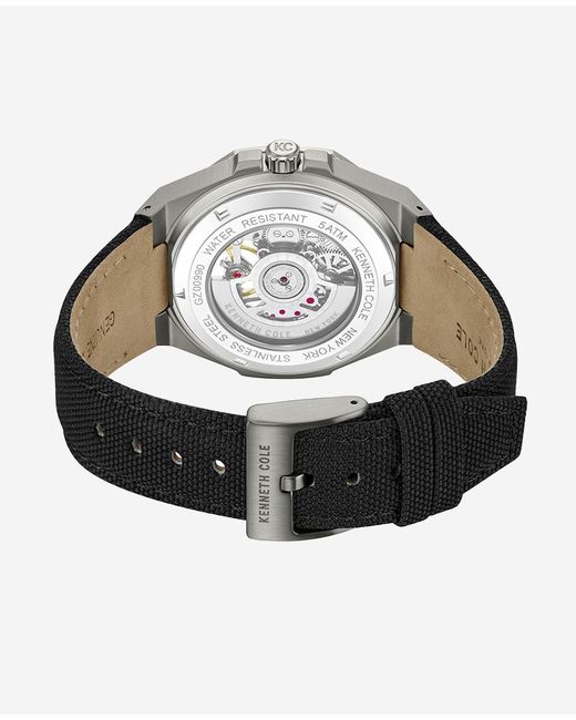 WHAT’S IN IT FOR YOU? Automatic watch Gunmetal stainless-steel case Grey tinted dial Silver hands and markers Automatic movement Self-winding Adjustable black nylon strap 5ATM water resistance Imported | Kenneth Cole | Skeleton Automatic Nylon Strap Watch in GUN