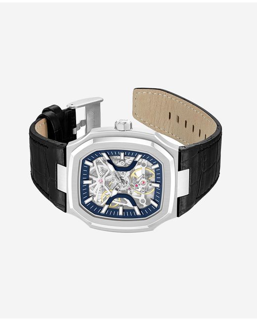 WHAT’S IN IT FOR YOU? Automatic watch Silver stainless-steel case Blue & silver dial Silver hands and markers Automatic movement Self-winding Adjustable genuine leather strap 5ATM water resistance Imported | Kenneth Cole | Skeleton Automatic Two-Tone Dial Leather Strap Watch in SILVER