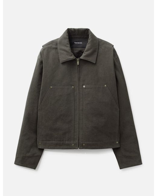 SeventhWorker JacketCotton exteriorLightly paddedMetal zipper closureTwo front pocketsInner chest pocketSnap buttons at cuffs and hemLinedMade in KoreaColor: Soil