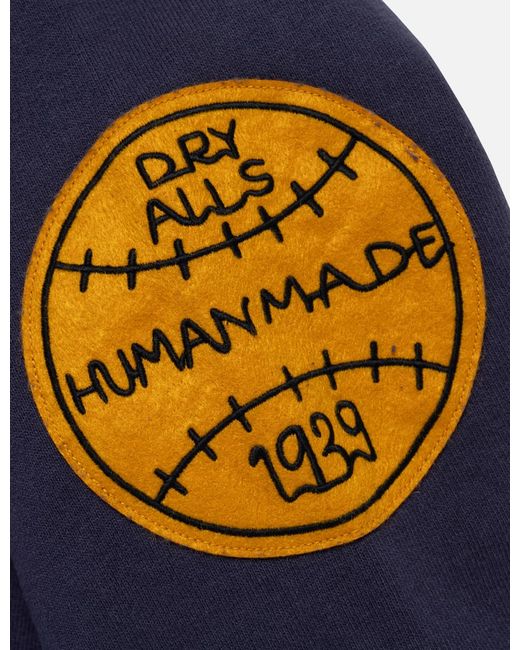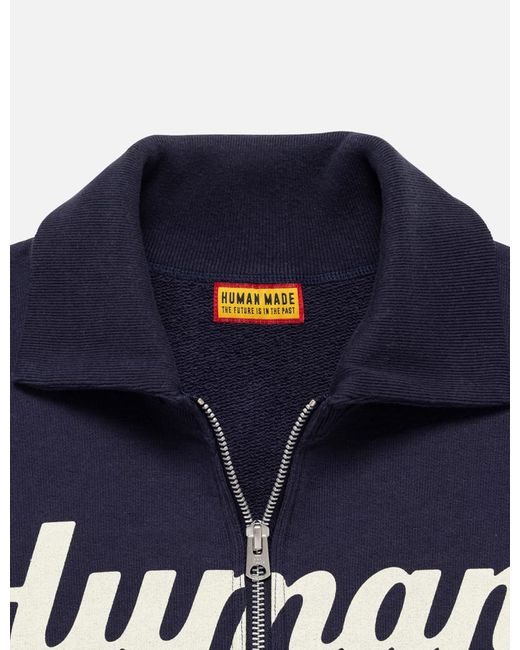 Human MadeHalf-Zip SweatshirtMade of fleecePointed collarHalf-zipper closureLong sleevesRibbed collar, cuffs and hemCollege-style brand logo on the frontWoven baseball patch on the left sleeveColor: Navy