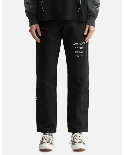 PleasuresZero x Pleasures Zero Work PantsZero x Pleasures collabrationMade of 13oz cotton canvasStone-washedEnforcing rivets and star rivetsZip flyLogo leather patch on backLoge print and patches on frontTwo front and two back pocketsTwo pockets on lower legs with zero's patch on rightColor: Black