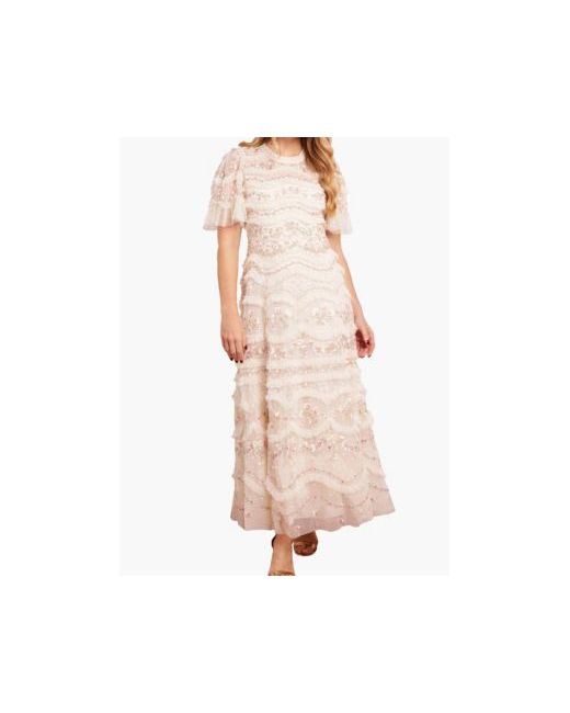 The Marina Ruffle Ankle Gown showcases delicate floral embroidery intertwined with soft frill detailing. Crafted from layers of tulle, this gown moves beautifully, capturing the spirit of feminine grace.