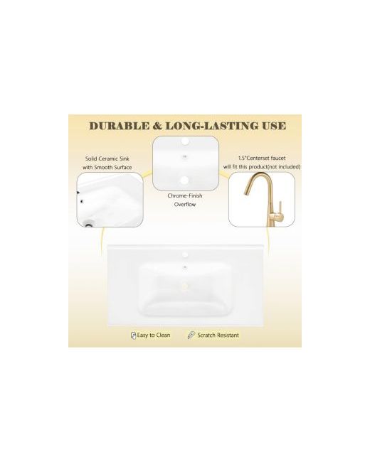 Elevate your bathroom with this elegantly designed 35.6" ceramic sink, crafted to bring sophistication and function to any modern vanity. The rectangular silhouette delivers a generous washing space, while the integrated overflow feature ensures peace of mind by preventing accidental spills. Engineered from high-grade ceramic, this basin offers lasting durability and maintains a flawless, glossy finish through daily use. The vessel-style installation allows for versatile placement on most vanity countertops, making it ideal for new bathrooms and remodels alike. The non-porous surface resists stains and scratches, making cleaning effortless—a simple wipe restores its shine. Designed for straightforward installation, this basin comes with all necessary mounting accessories, ensuring a seamless fit and a hassle-free setup. Redefine your daily bathroom experience with timeless style, practical features, and reliable quality. Dimensions: 35.6"W × 18.7"D × 7.4"H.