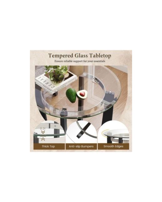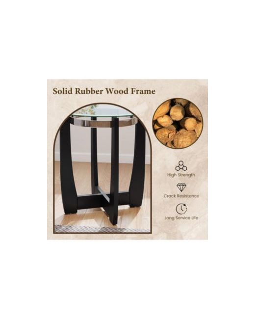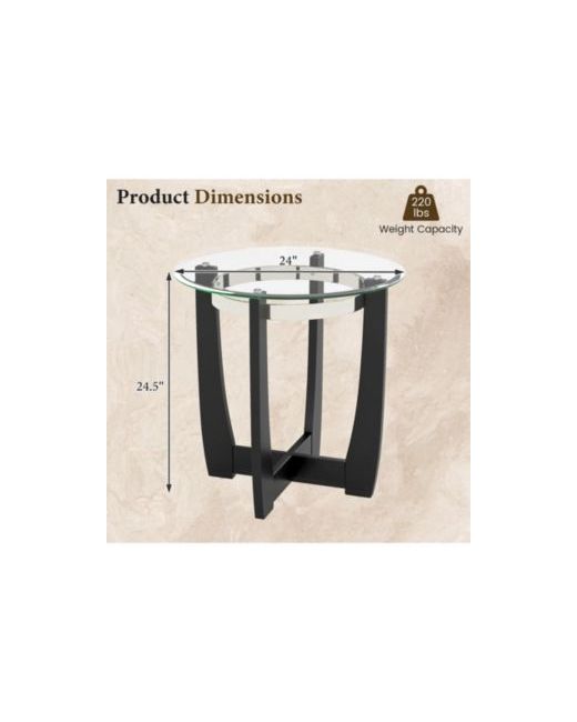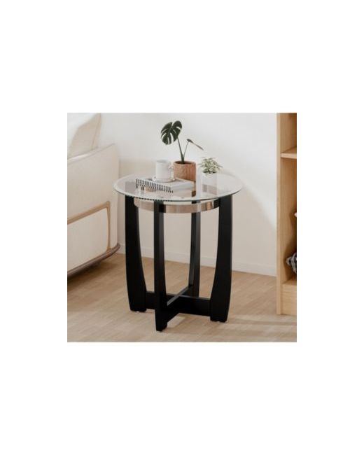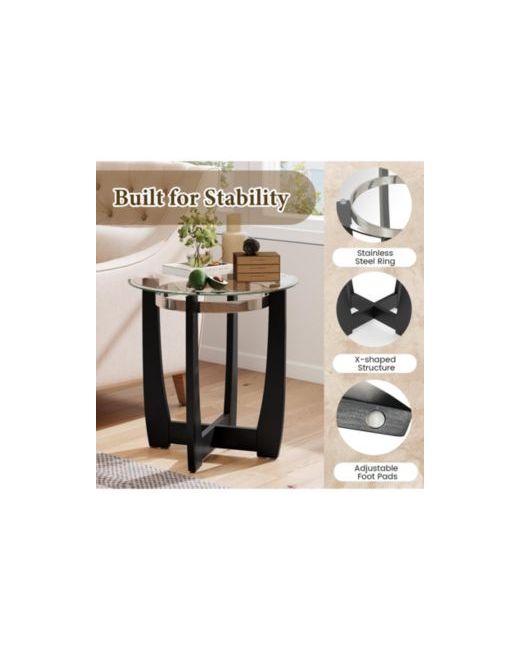 Introduce understated elegance with a 24 in round accent table that pairs a clear tempered glass top with a cross-shaped rubber wood base. The glass surface resists scratches and heat, letting you set down hot mugs and cold glasses without worry. A stainless steel ring connecting the wood legs adds structural support and a polished accent detail. Anti-slip bumpers beneath the glass prevent shifting, while the sturdy frame supports up to 220 lbs.
