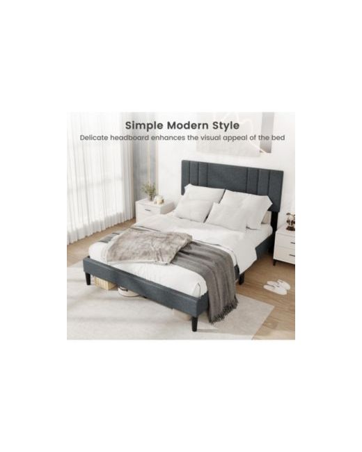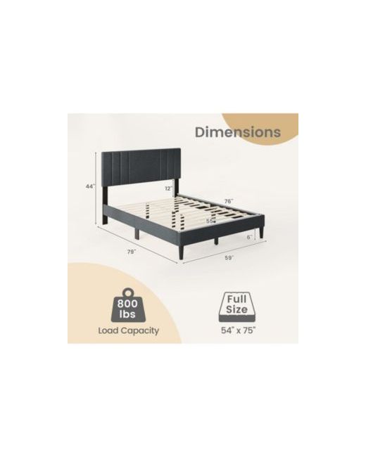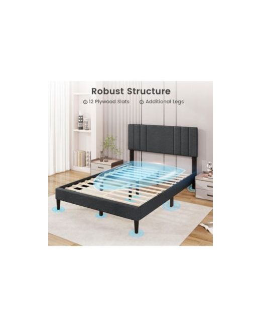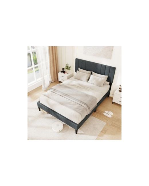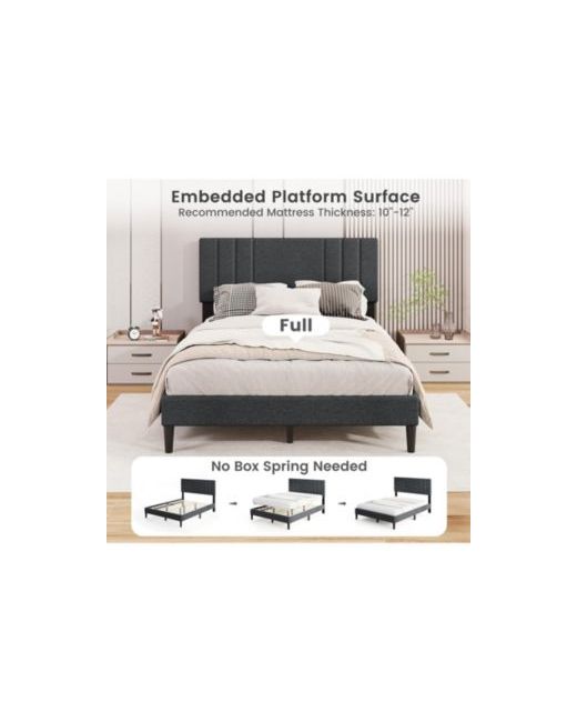 Bring a clean, modern look to your bedroom with this upholstered platform bed frame featuring a vertical channel tufted headboard. The headboard is padded with elastic sponge and wrapped in soft faux linen fabric, offering a comfortable surface to lean against when you want to unwind. Built for everyday use, the frame is supported by 12 plywood slats and reinforced legs to help provide stable, even support for your mattress. The embedded platform design helps keep the mattress positioned, while the platform construction allows you to place the mattress directly on the slats without adding a box spring. With 6 inches of clearance underneath, this bed frame leaves space for easier access under the bed during routine cleaning. Designed for a full mattress and recommended for 10 to 12 inch mattress thickness, it s a practical choice for bedrooms, guest rooms, or apartments.