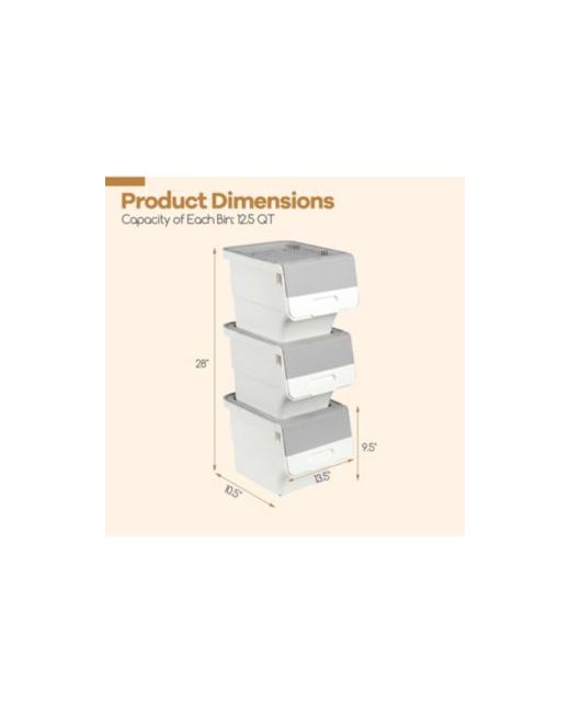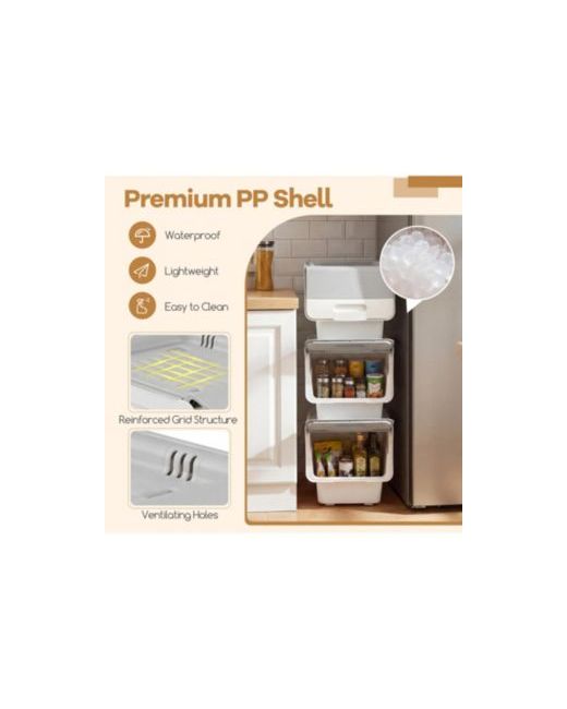 Keep everyday essentials neatly sorted with this set of 3 stackable storage bins on wheels. Each bin offers a 12.5 Qt capacity in a compact 13.5" x 10.5" x 9.5" size, making it easy to organize snacks, supplies, or small household items in the kitchen, bedroom, closet, or laundry area. Interlocking lids help the bins stack securely, while the stay-open front lid design lets you see and grab what you need without unstacking. Built-in wheels roll smoothly for easy moving, and the Pp construction wipes clean for simple care.
