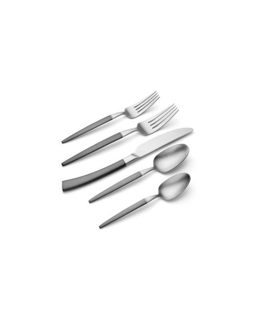 Sleek and tapered with an in-motion whip-like shape, Adjacent looks so sharp it might cut the air. Torpedo-shaped black handles accompany shining stainless-steel to form a two-toned color contrast that culminates in the boomerang curvature of the knife.