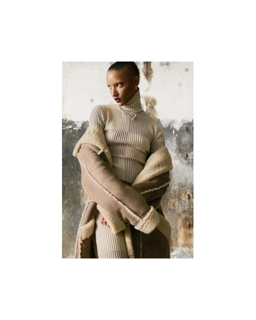 Midi coat with a turned leather effect, synthetic fur interior, front pockets, and button closure.