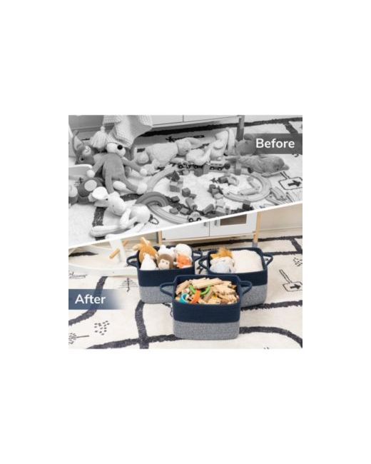 Available in three sizes: Small (13"L x 10"W x 9"H), Medium (18"L x 14"W x 12"H), and Large (22"L x 17"W x 12"H). Soft Material: Crafted from woven cotton rope, these baskets offer a soft touch while maintaining a sturdy structure that stands upright on its own the stable base ensures they never sag or collapse. They fit perfectly into various shelving units, Tv cabinets, wardrobes, office desks, and nursery bookshelves. The breathable material effectively protects stored items from dust accumulation. Tidy Space: Ideal for organizing bedding, baby bottles, blankets, diapers, toys, magazines, books, documents, remote controls, vitamins, art supplies, and personal sundries, helping you effortlessly create a neat and organized home or office environment. Thoughtful Handle Design: Features wide, woven handles that make it easy to pull the baskets out from shelves reinforced with multiple rows of stitching, these handles are far more secure and durable than plastic or metal alternatives, ensuring they will never detach. Washable: Machine washable for easy cleaning!