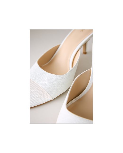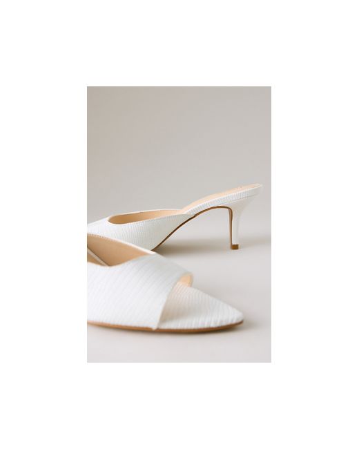 By Maeve Leather, Satin upper PU lining, sock Rubber outsole Slip-on styling Pointed, open toe Imported Point Toe Mule Heels by Maeve in White, Women's Size: 38, Leather/Rubber/Satin at Anthropologie