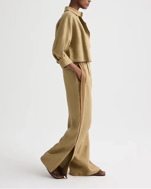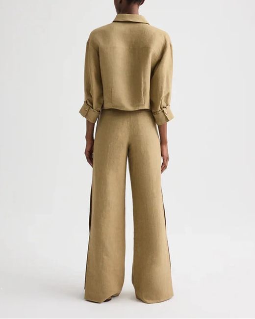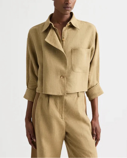 The Next Chapter Top in Washed Linen by TWP is a cropped button-front top featuring a relaxed boxy silhouette, chest patch pocket, a classic point collar, and a signature double roll button cuffs. Perfect for elevated office wear. Material: 100% Linen Fit: Cropped fit Style it with: Matching Crosby St Pant Model is 5'10" and wearing a size Small.