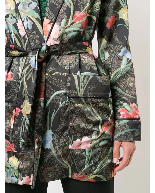 Multicoloured floral belted jacket from Off-White featuring a notched collar, long sleeves, a floral print, a belted waist and two front pockets.