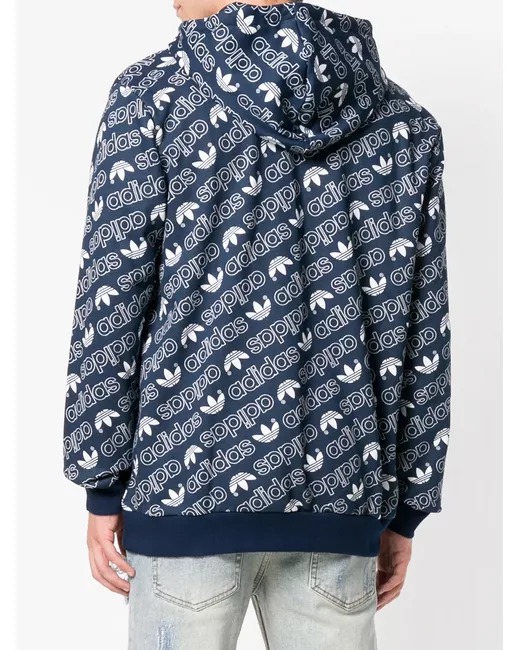 Sports are deeply rooted within the brand ideology at Adidas and continue to play a major role in the design and construction of the label’s contemporary products. This navy and white zip front hoodie is crafted from a cotton blend and features a hood with drawstring tie fastenings, long sleeves, a front zip fastening, a relaxed shape and an all over logo print.
