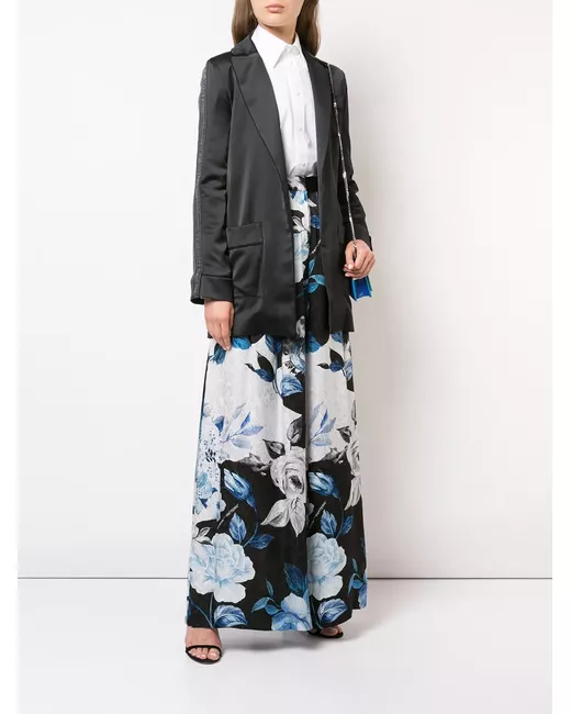 Black, blue and white silk floral palazzo pants from Off-White featuring a high rise, a waistband with belt loops, a hook and zip fastening, a pleated design, a wide leg, a long length and a floral print.