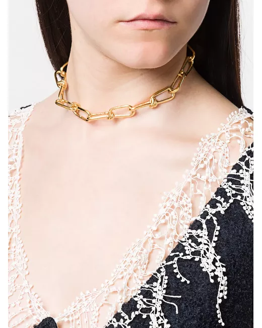 Annelise Michelson takes inspiration from photographer Nobuyoshi Araki’s sensual work and the raw element of industrial cables in her Wire collection. This gold plated brass Wire choker from Annelise Michelson features a barbed link chain.