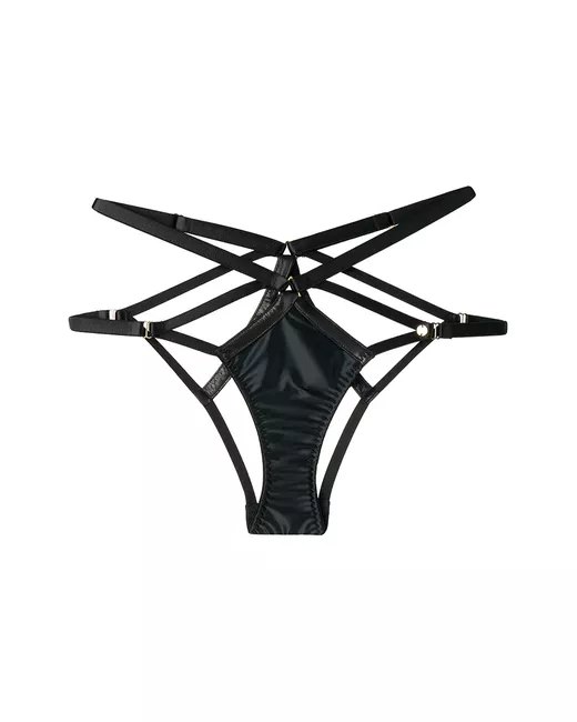 Black stretch silk satin Jade open briefs from SOMETHING WICKED featuring leather trims, an open back and adjustable straps.