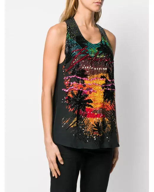 The designer infuses Balmain’s signature glamour and lavish embellishments into classic wardrobe staples, presenting a collection of wearable yet striking silhouettes for the fashionable modern woman. Need some sparkle for summer nights? This sequin embellished tank top from Balmain is the perfect choice. Featuring a scoop neck, a sleeveless design and a sunset sequin embroidery.