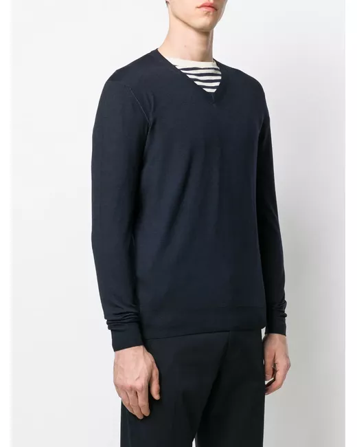 Blue merino wool plain v-neck jumper from Drumohr featuring a ribbed v-neck, long sleeves and a straight hem.
