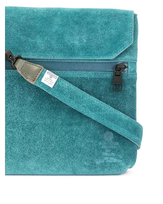 Turquoise blue suede flat shoulder bag from AS2OV featuring a detachable shoulder strap, a front zip compartment, an internal zipped pocket and a foldover touch strap fastening.
