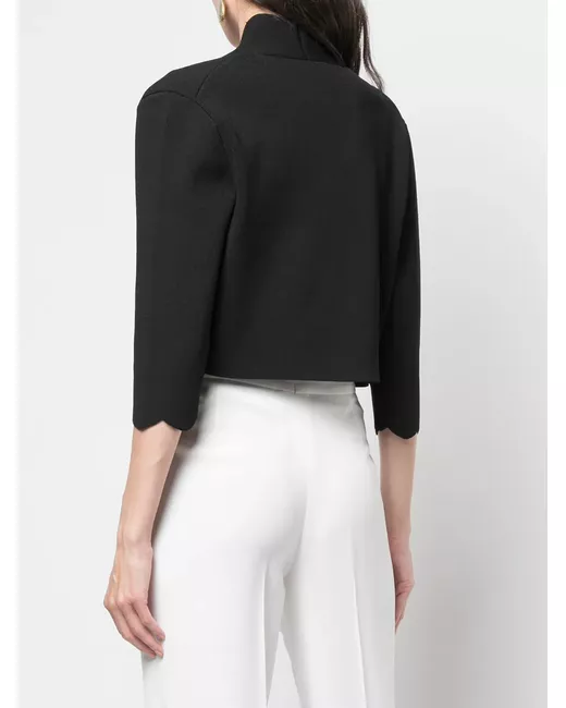 Black wavy trim cropped jacket from Lela Rose featuring an open front, three-quarter length sleeves and a fitted silhouette.