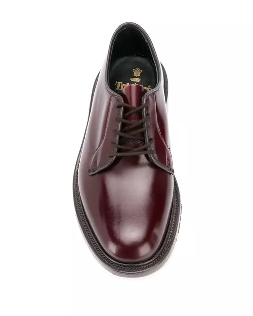 Burgundy leather Robert derbies from Tricker's featuring a round toe, stitched panels, a lace-up front fastening, a brand embossed insole and a non-slip rubber sole.