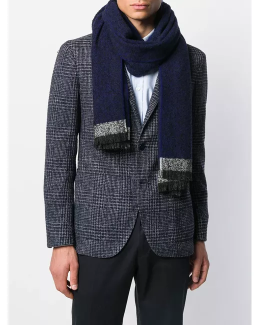 Midnight blue and white virgin wool-blend herringbone scarf from Zanone featuring fringe details and contrast stripe trims.