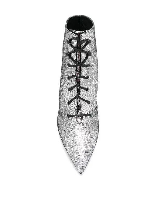 The definition of Saint Laurent? Parisian elegance with a new-age rock-and-roll edge. Expertly crafted Silver-tone leather Kiki boots from Saint Laurent featuring a metallic sheen, a pointed toe, a lace-up front fastening and a kitten heel.