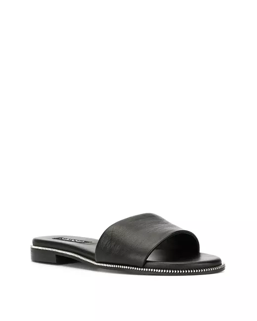 Ebony black kid leather Gilly sliders from Senso featuring an open toe, a silver zip welt detail, a branded insole and a flat heel.