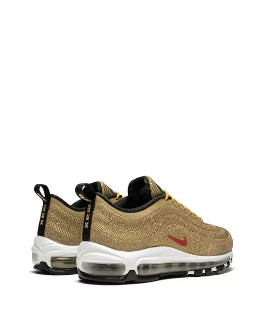 Supplied by a premier sneaker marketplace dealing with unworn, already sold out, in demand rarities. Each product is rigorously inspected by experienced experts guaranteeing authenticity. Upping the ante on the already iconic colorway of the already iconic silhouette, the Air Max 97 Swarovski features Swarovski's proprietary Crystal Fabric. The flexible fabric in the overlays includes thousands of tiny crystals bunched together to achieve a shimmering effect as the shoe moves. The aura of opulence is extended with a gold upper and red accents on the tongue and midfoot. This is a one-of-a-kind model for a one-of-a-kind collaboration.