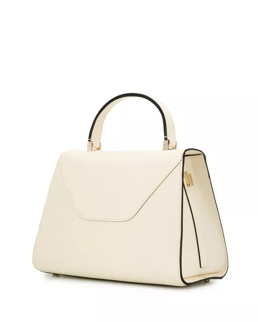 White calf leather Iside top-handle bag from Valextra featuring a cross body strap, a front flap closure, an interior zipped compartment and a front gold-toned plaque detail.