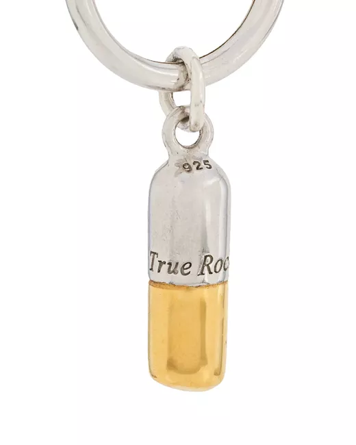 Sterling silver pill hoop earring from True Rocks featuring a post back closure and a gold-tipped pill pendant. This is a single earring.