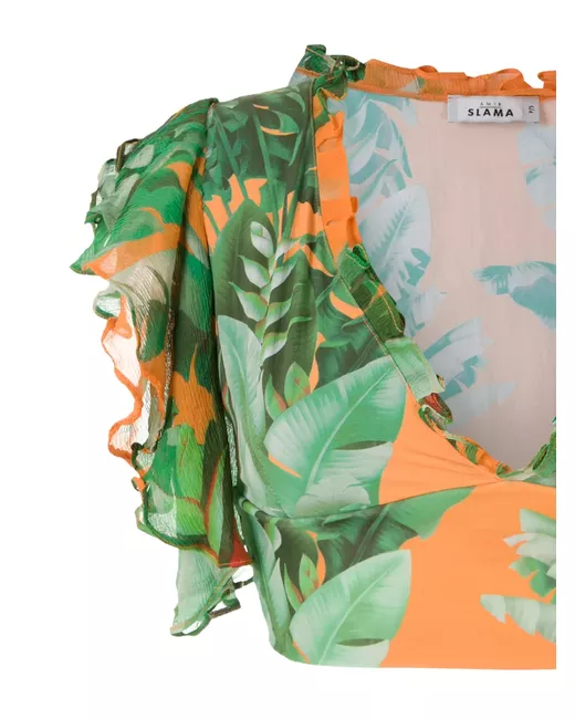 Green and orange printed crop top bikini set from Amir Slama featuring a top with a v-neck, no bra support, ruffled sleeves, a ruffled neck, and a bottom with a frill trim, a strappy design, decorative buttons, an all-over print, an elasticated trim, a lining and a stretch fabric with cool touch. Please note the print may differ slightly from the item pictured.