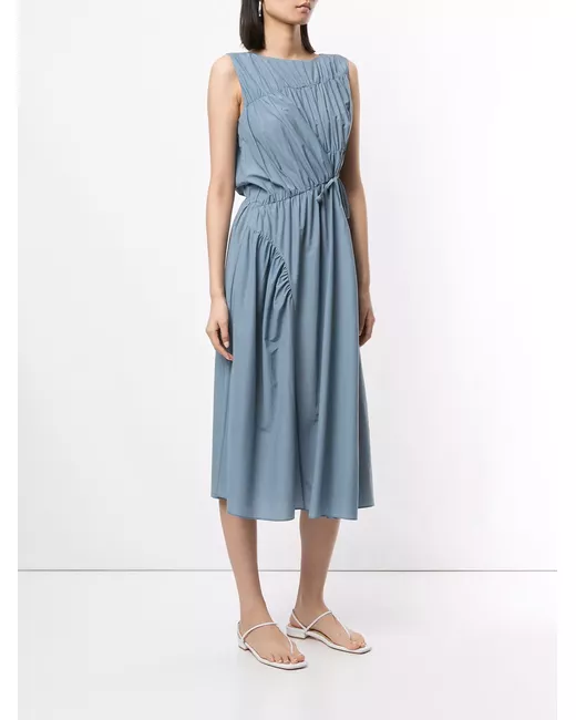 Blue multi-directional ruched shift dress from GOEN.J featuring a round neck, a gathered design, a drawstring waist, a back button fastening and an asymmetrical shape.