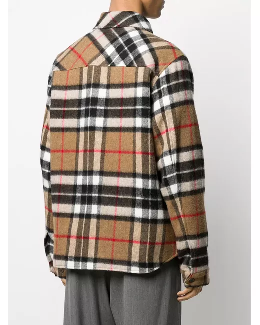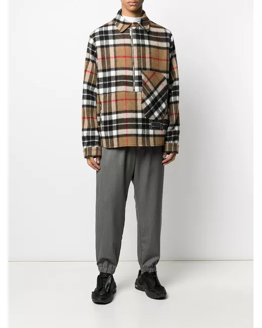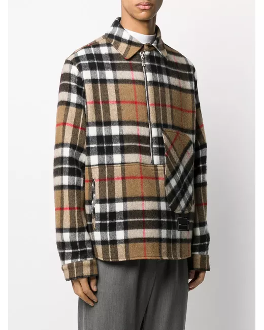 Camel-coloured checked half-zip wool shirt from We11Done featuring an oversized fit, a multicoloured pattern, a pointed collar, long sleeves, front welt pockets and a curved hem. Please note this item is unisex and sold in men's sizing.