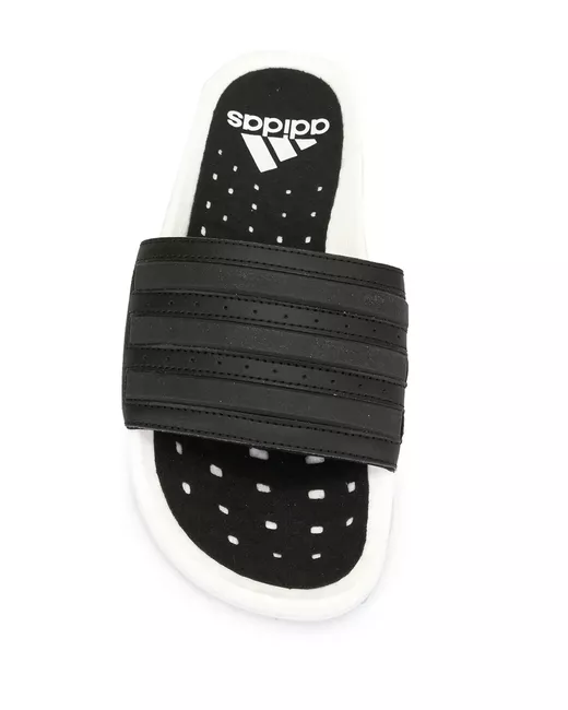 Black Adilette Boost sandals from adidas featuring a slip-on style, an open toe, a flat sole, a signature three stripe detail and a branded insole. Supplied by a premier sneaker marketplace dealing with unworn, already sold out, in demand rarities. Each product is rigorously inspected by experienced experts guaranteeing authenticity.
